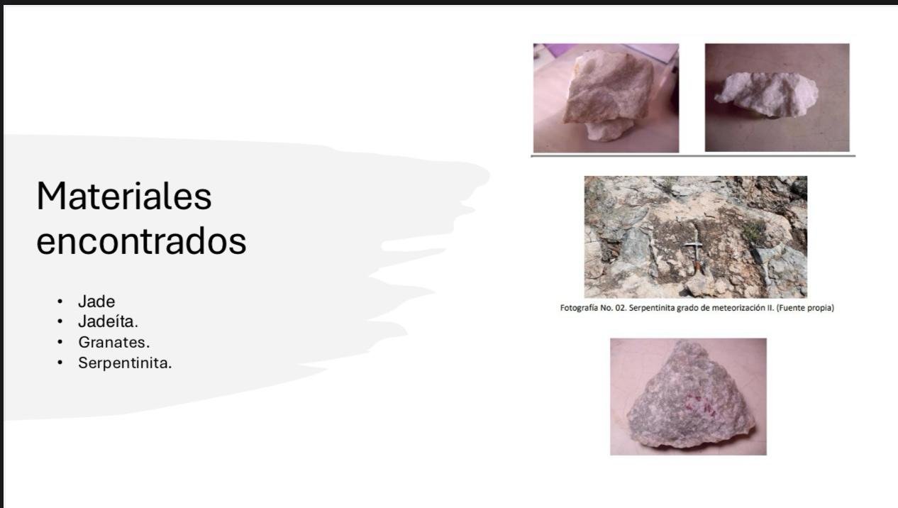 - En el terreno se ha encontrado (Jade, jadeita, granates, serpentinita)